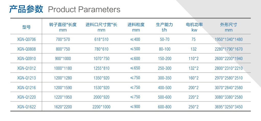 我公司生产的重型锤式破碎机和轻型锤式破碎机锤盘均采用Q345-B锰板数控切割机下料,并经过渗碳处理,充分保证转子盘的质量和耐磨性,避免了小厂家所生产铸造型转子盘的铸造缺陷,超大型转子直径,使整个破碎机的破碎动力和整体产量大大提高。每台机器转子易损部位均有耐磨护圈,受损以后只需更换耐磨护圈,不必转子整体更换,大大提高转子寿命。也避免因为转子离线修复而造成的时间损失。技术参数